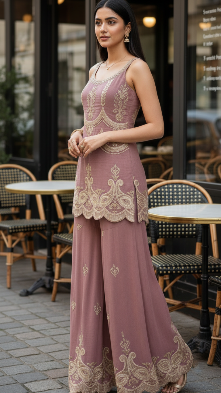 Step into elegance with our Heer Sharara Set, crafted in a dreamy mauve hue adorned with intricate golden embroidery. The short kurti features delicate pearl cutdana handwork and scalloped hem details, paired with flared sharara pants that carry matching embroidery for a regal finish. A contrasting deep rose shaded dupatta with subtle accents completes the ensemble, adding just the right touch of sophistication.