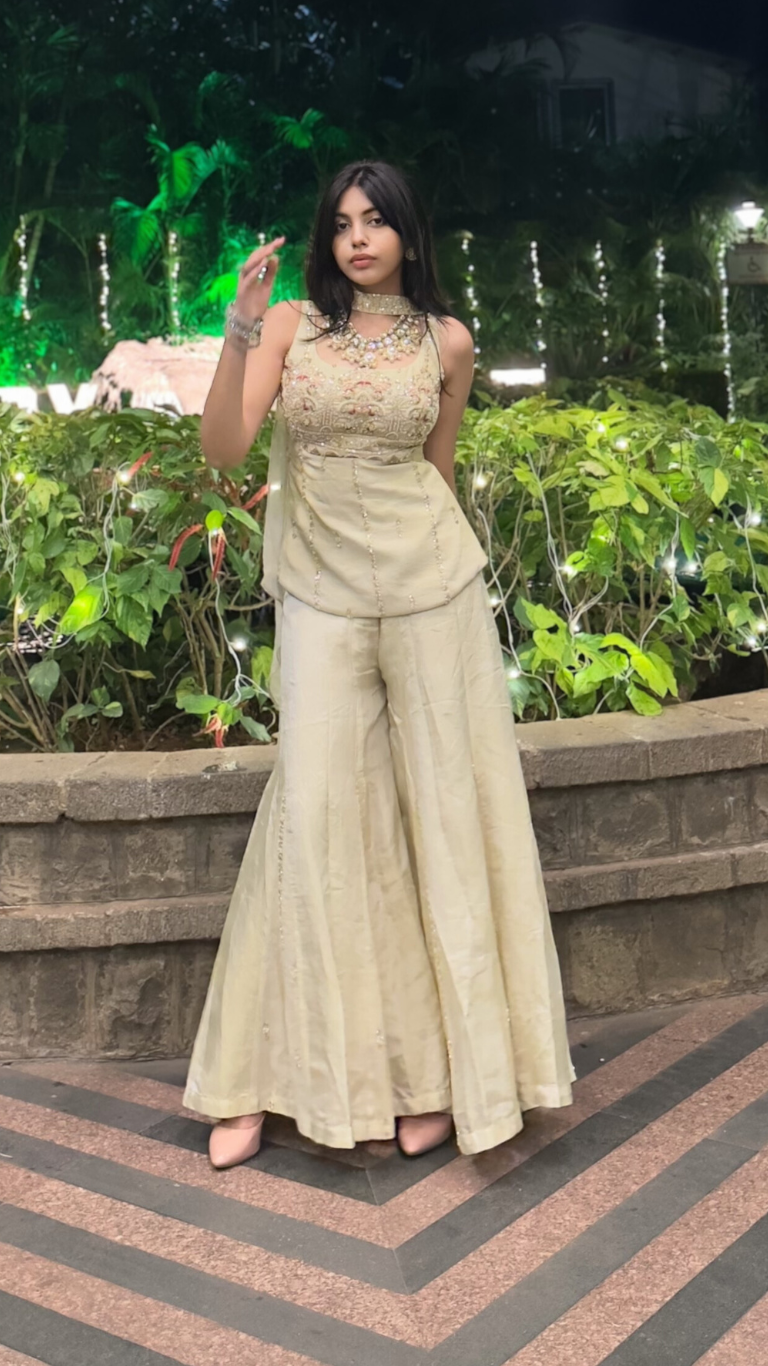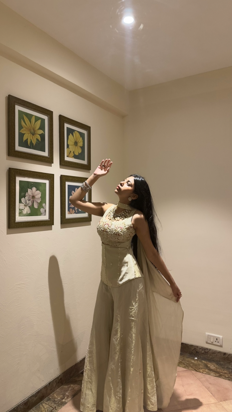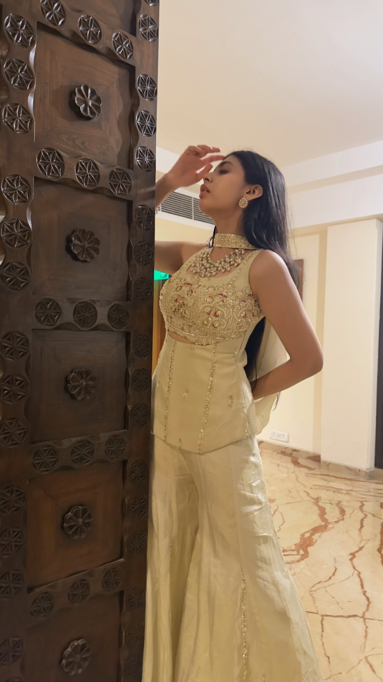 This dreamy golden corset set is all about that glam vibe — structured fit, flowy palazzos, and a dupatta that moves like magic. Perfect for when you wanna serve ethnic elegance with a modern edge. From wedding nights to festive selfies — this outfit is your spotlight moment ✨